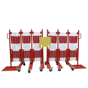 Barrière extensible, pied en acier et roulettes, rouge / blanc, longueur max. 16000 mm